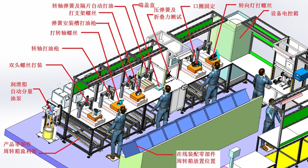 該設備主要服務:汽車后視鏡各零部件組裝,線體為半自動組裝線,部分工位有工人參與組裝。